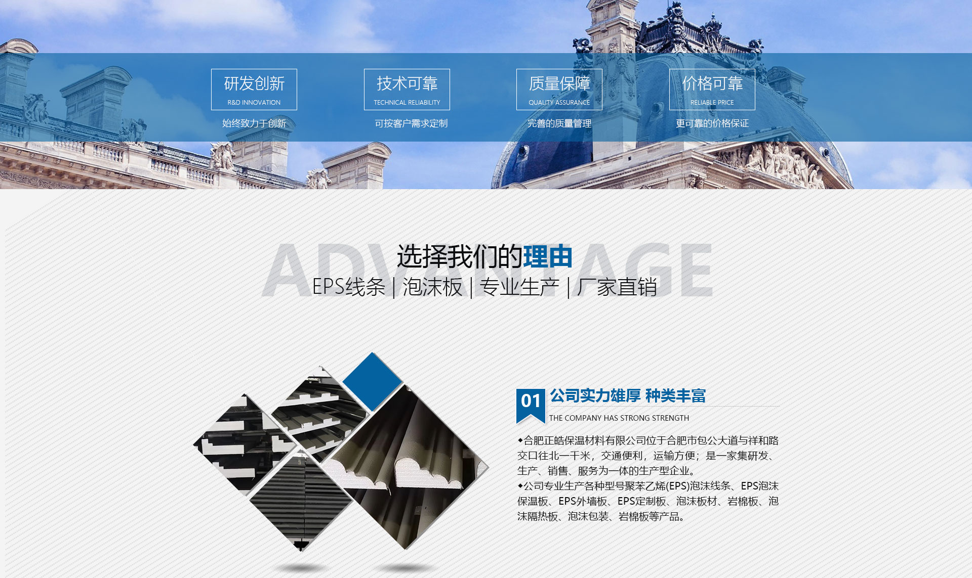 合肥正皓保溫材料有限公司位于合肥市包公大道與祥和路交口往北一千米,交通既便利,運輸也方便;是一家集研發、生產、銷售、服務為一體的生產型企業。公司專業生產各種型號EPS泡沫線條、EPS泡沫保溫板、EPS外墻板、EPS定制板、泡沫板材、巖棉板、泡沫隔熱板、泡沫包裝、巖棉板等產品。我們擁有相當齊全的產品結構,并且,所生產的產品品質在同行業中較高,不允許一件有疑問的產品流向市場,從產品的研發、原材料的選料、加工制造、銷售包裝直到售后服務層層嚴格把關。